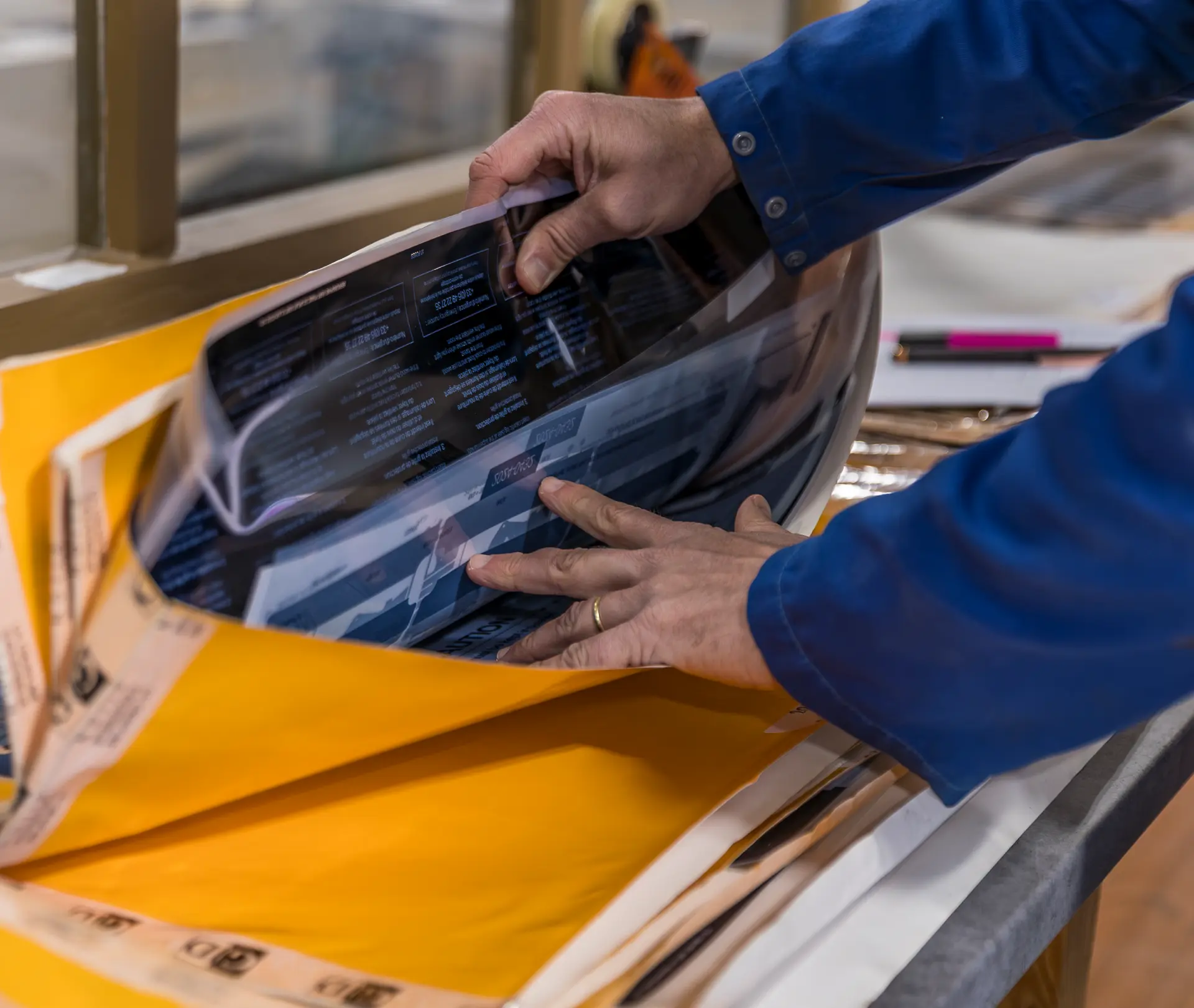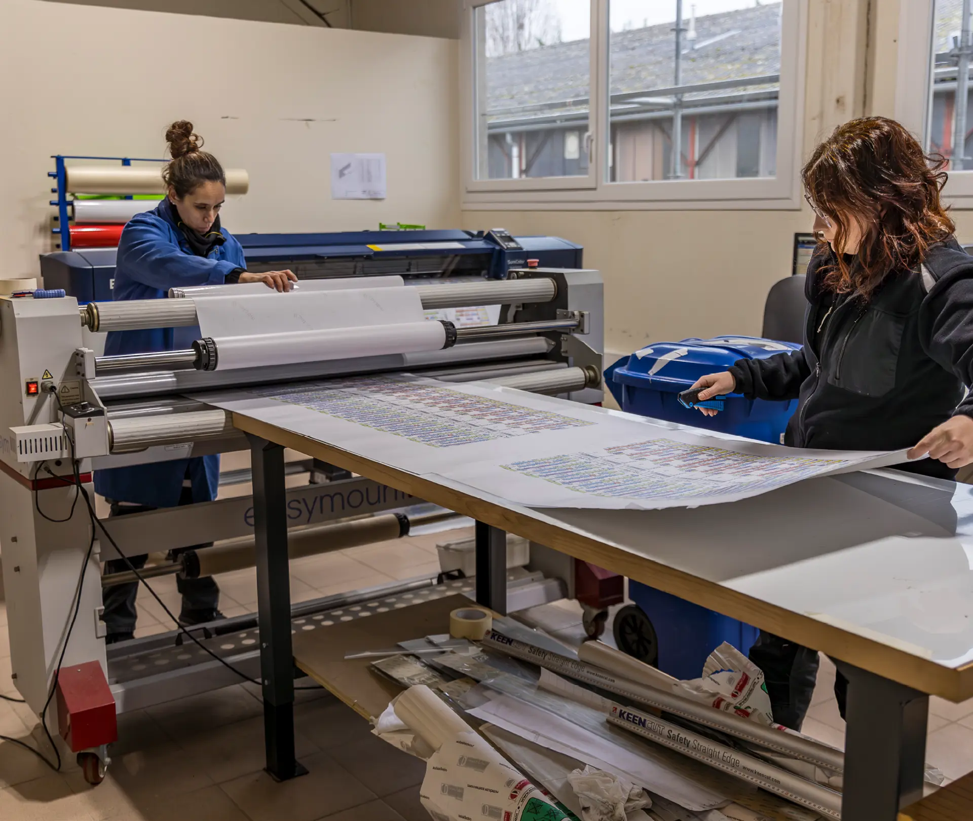 Le dépôt des encres se fait au dos de la matière, en miroir. L’adhésif double face est ensuite posé sur l’encre.