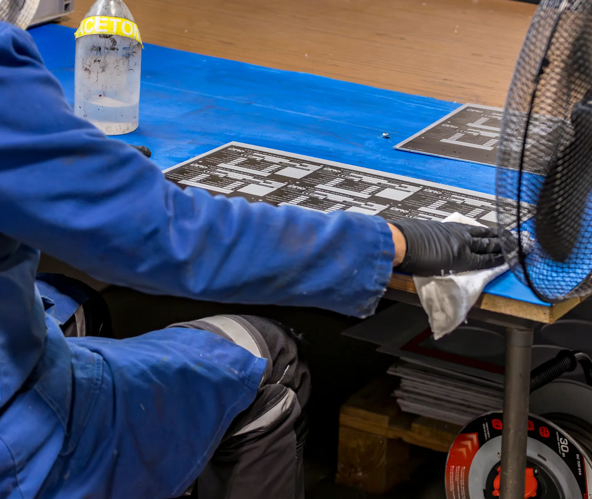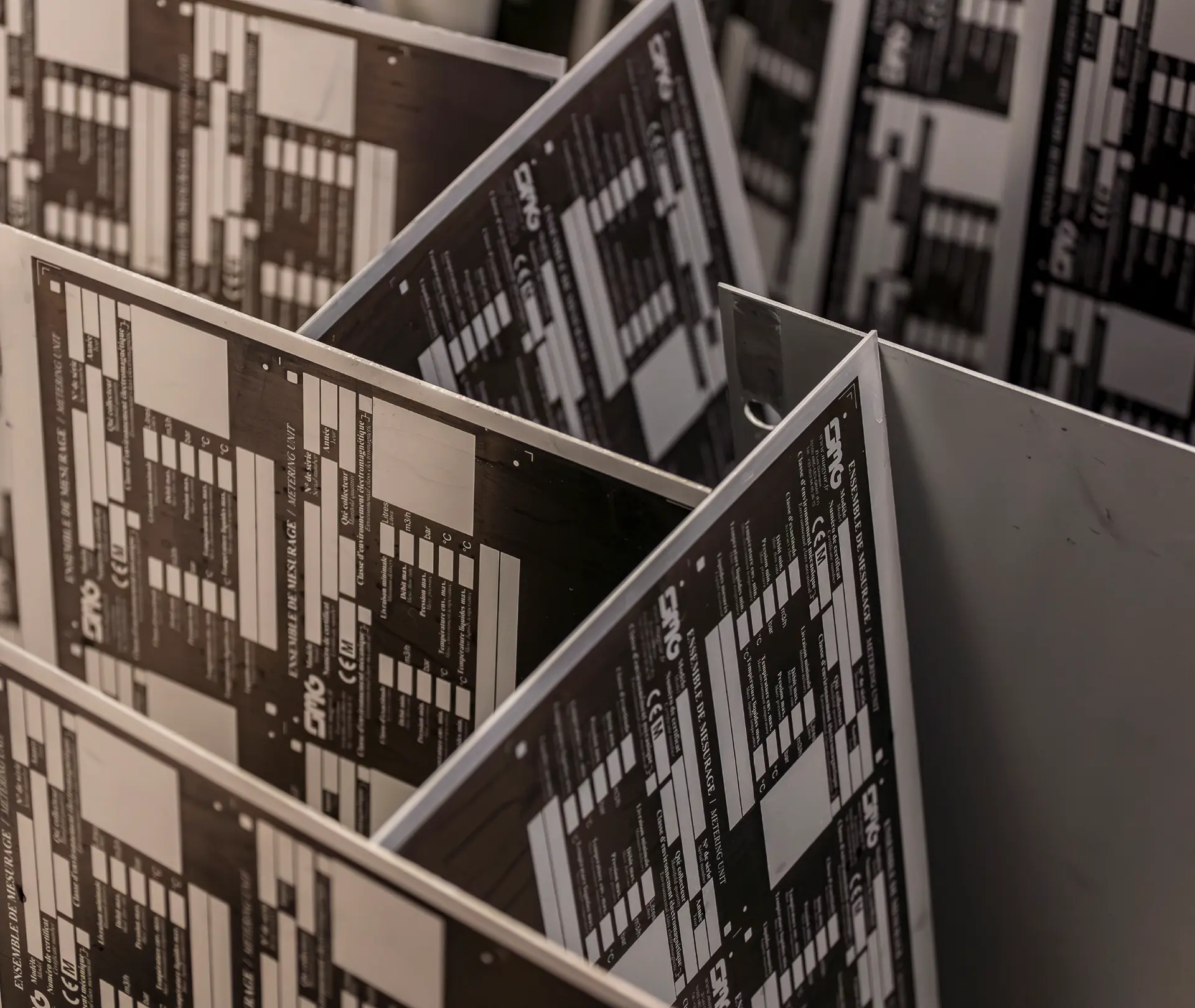 Les encres sont chargées en ions opposés à ceux des pores réalisés dans l’aluminium, faisant qu’elles sont comme aimantées. De plus, nous colmatons les plaques après impressions, refermant les pores, ce qui permet d’encapsuler l’encre. Le résultat est un produit encore plus durable que la sérigraphie standard, avec une encre protégée contre les rayures. Un produit hautement employé dans le secteur ferroviaire notamment.