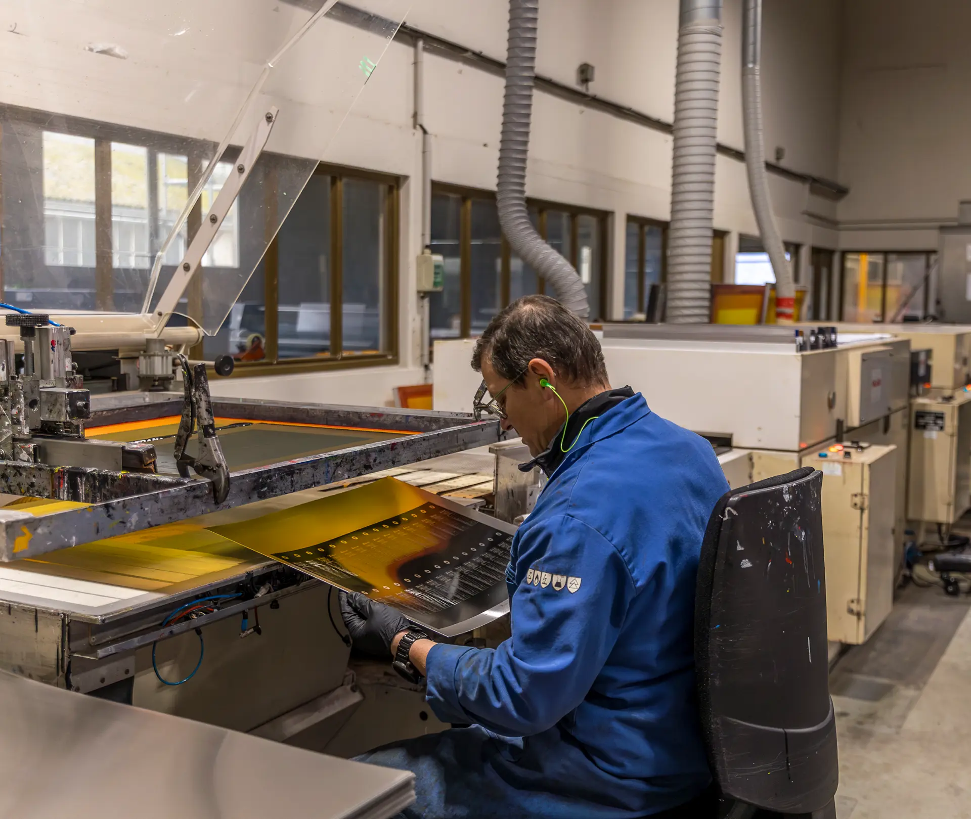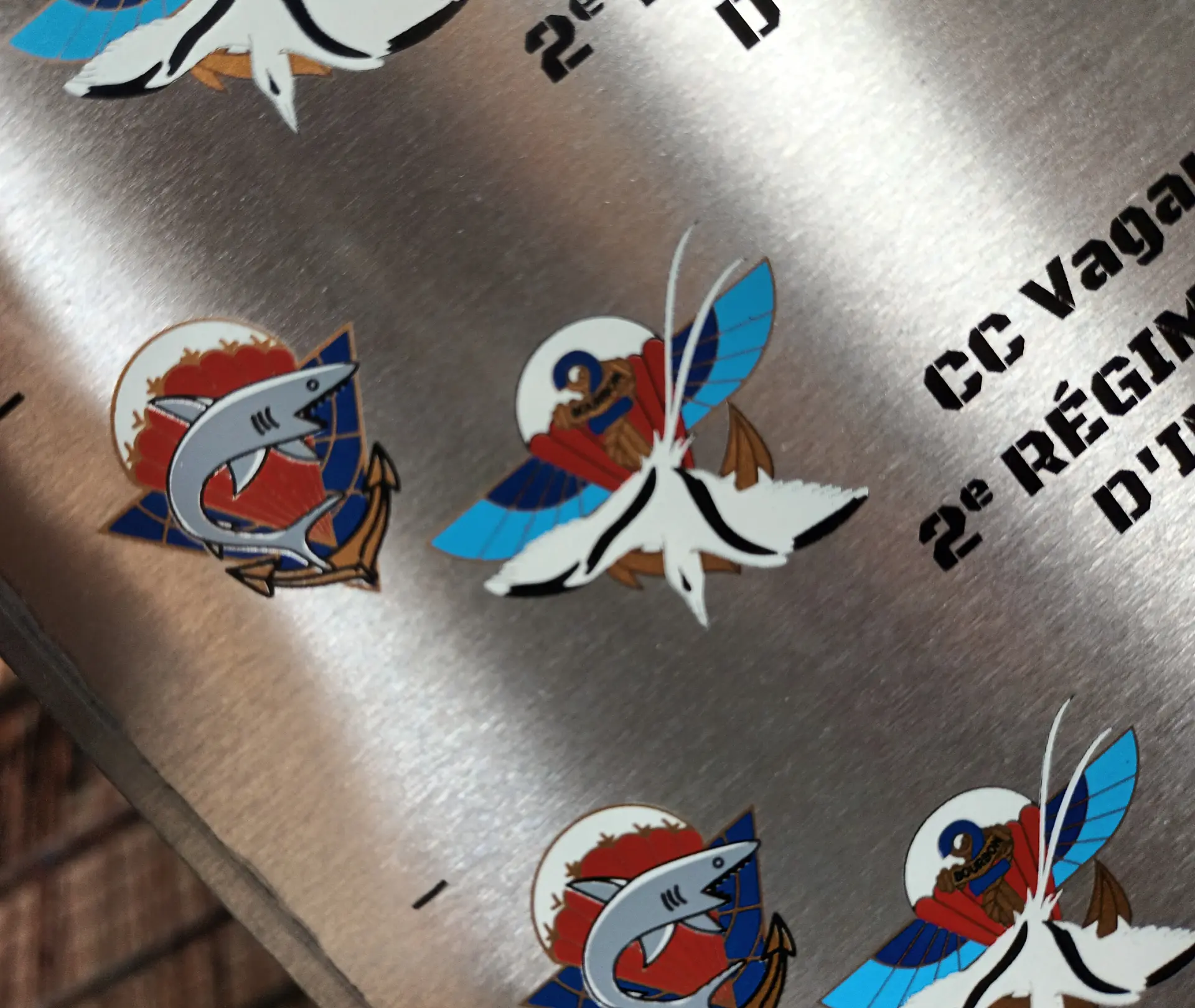 Entre chaque couleur, le support nécessite un temps de cuisson de l’encre déposée. A chaque métal sa gamme d’encres, que nous utilisons depuis longtemps pour la plus grande satisfaction de nos clients. La Gravure Industrielle est reconnue pour sa préparation particulièrement méticuleuse du métal, pour ses encres résistantes, ainsi que son vernis polyuréthane cuit au four, appliqué sur toutes nos plaques en aluminium.